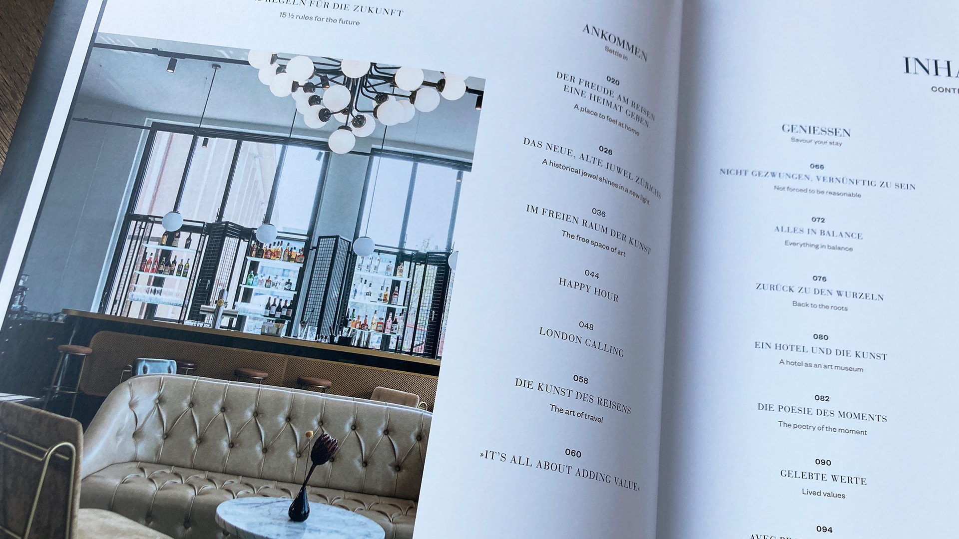 A place to feel at home. The art of traveling. We dream, we arrive, we enjoy. Le »Sur-Mesure« Atelier by Hermès in Paris, a dinner at Studio Bellerive on Lake Zurich, Matthias Horx’s 15 1/2 rules – the theme FUTURE runs like a thread through the relaunch of the magazine. His visual identity was developed and designed by Simone Leitenberger. The switch to uncoated paper of the section ENJOY in the middle of the magazin and embossing round off the picture in terms of processing technology. Edition 01.