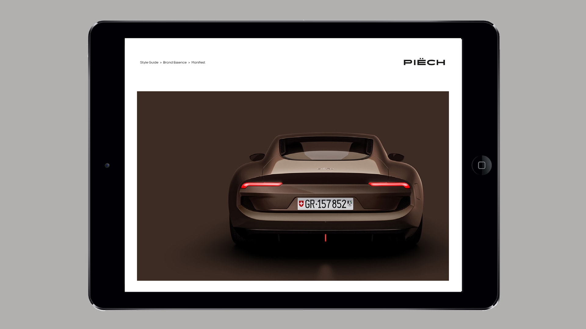 A beautifully evolving road ahead. Niche is the new luxe. Creating value through rarity. The new Piech Brand Book is released alongside the prototype from the Swiss electric vehicle manufacturer. Disruptive purism and effortless lightness are part of the Piech’s DNA. Perfect aesthetics and harmony are design principles that the new brand manifests – in both analogue and digital form. The Brand Book is published in two languages with different designs for English and German, bound using a special technique with a very flat appearance, featuring embossed Piech dots on the cover.