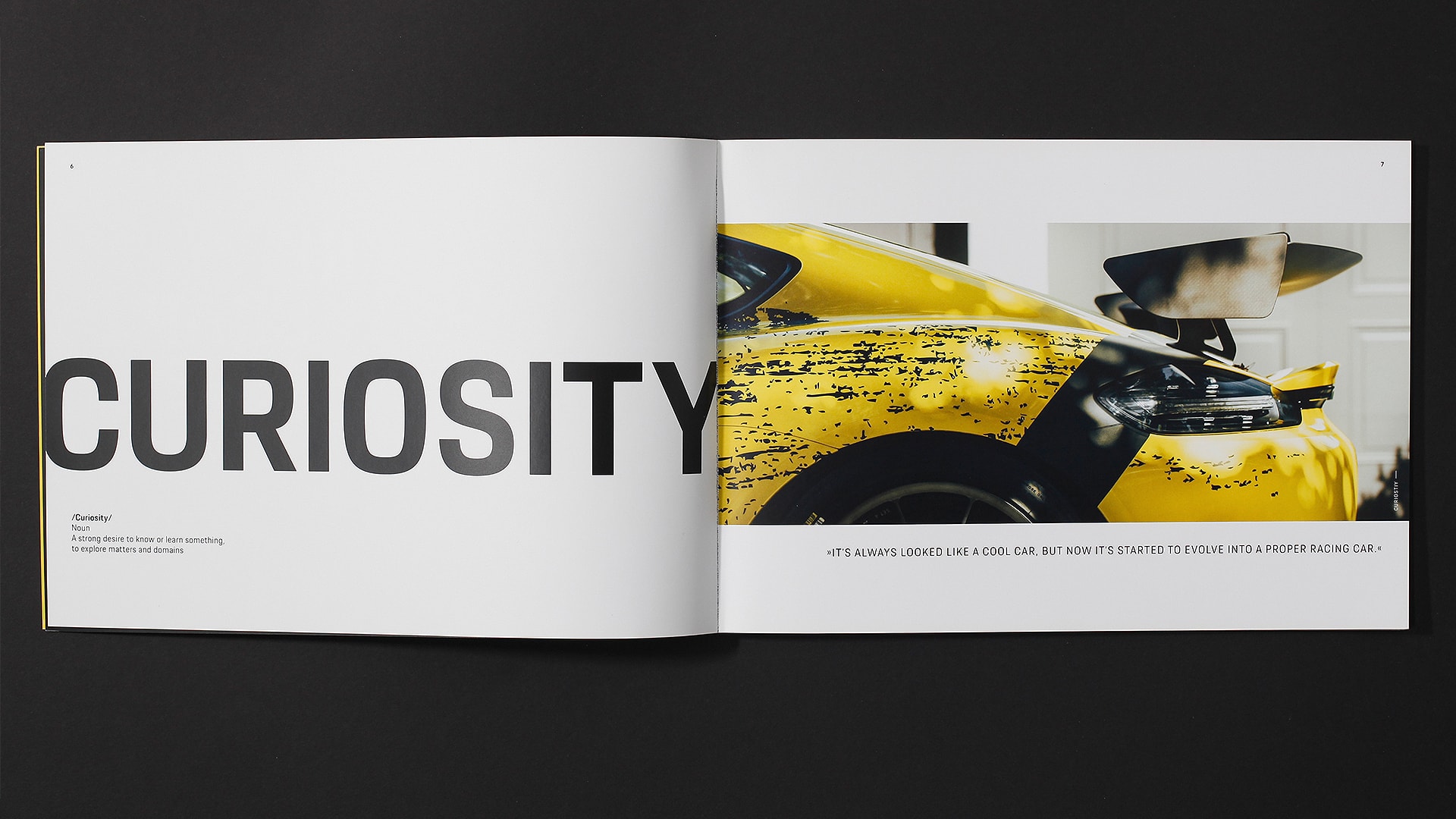 The studio designs the magalogue for the new Porsche 718 Cayman GT4 Clubsport for ramp.space. In collaboration, a magazine-style edition is created to present the new vehicle. Baseball star and racing driver CJ Wilson is portrayed in interviews and photographs. Striking typography in extreme font sizes and design elements from the vehicle’s design reflect the character of the new.