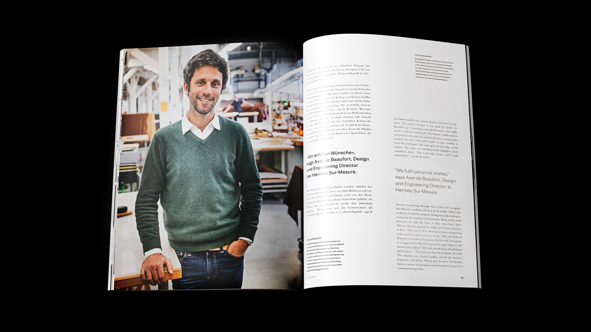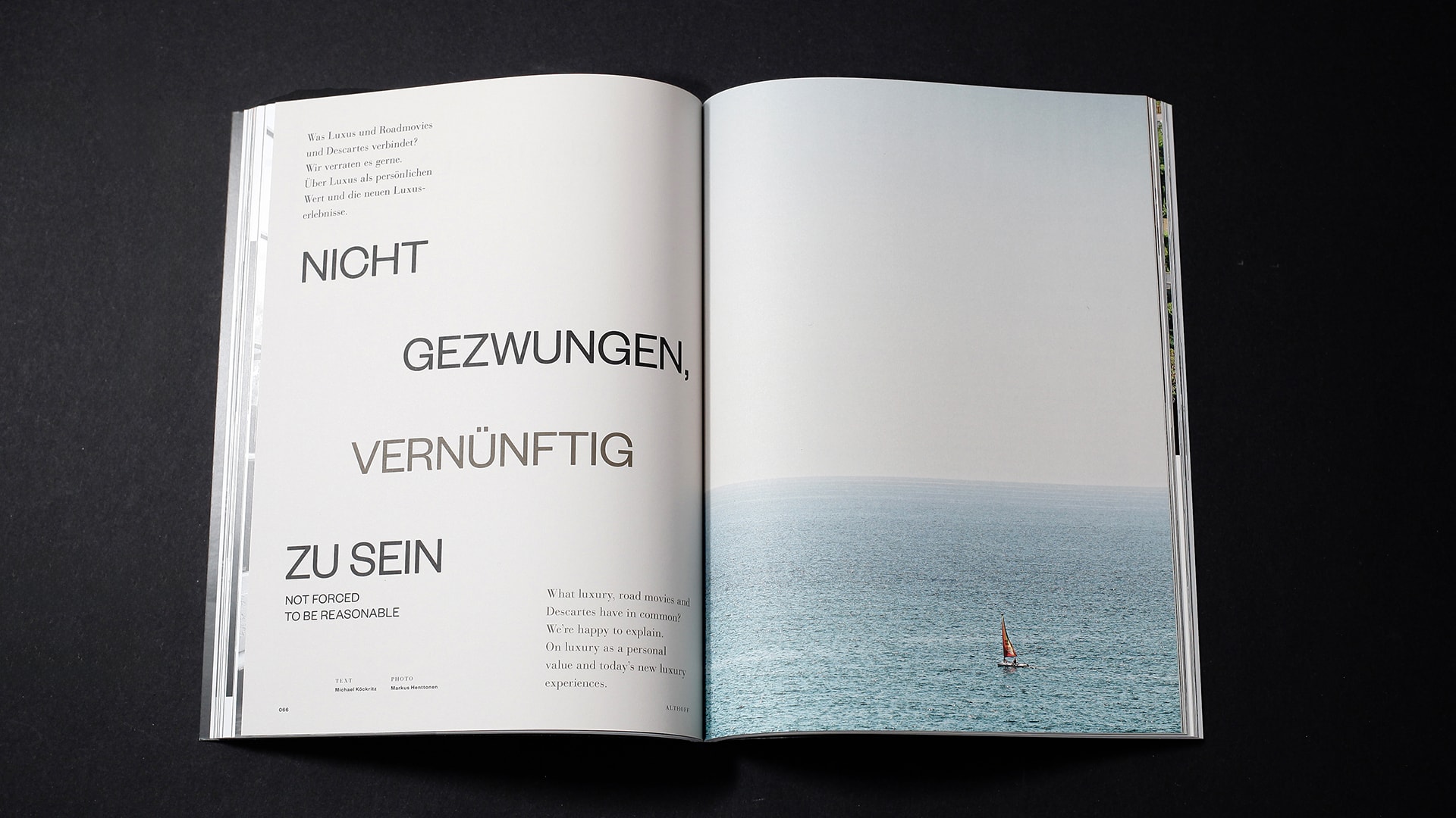 A place to feel at home. The art of traveling. We dream, we arrive, we enjoy. Le »Sur-Mesure« Atelier by Hermès in Paris, a dinner at Studio Bellerive on Lake Zurich, Matthias Horx’s 15 1/2 rules – the theme FUTURE runs like a thread through the relaunch of the magazine. His visual identity was developed and designed by Simone Leitenberger. The switch to uncoated paper of the section ENJOY in the middle of the magazin and embossing round off the picture in terms of processing technology. Edition 01.