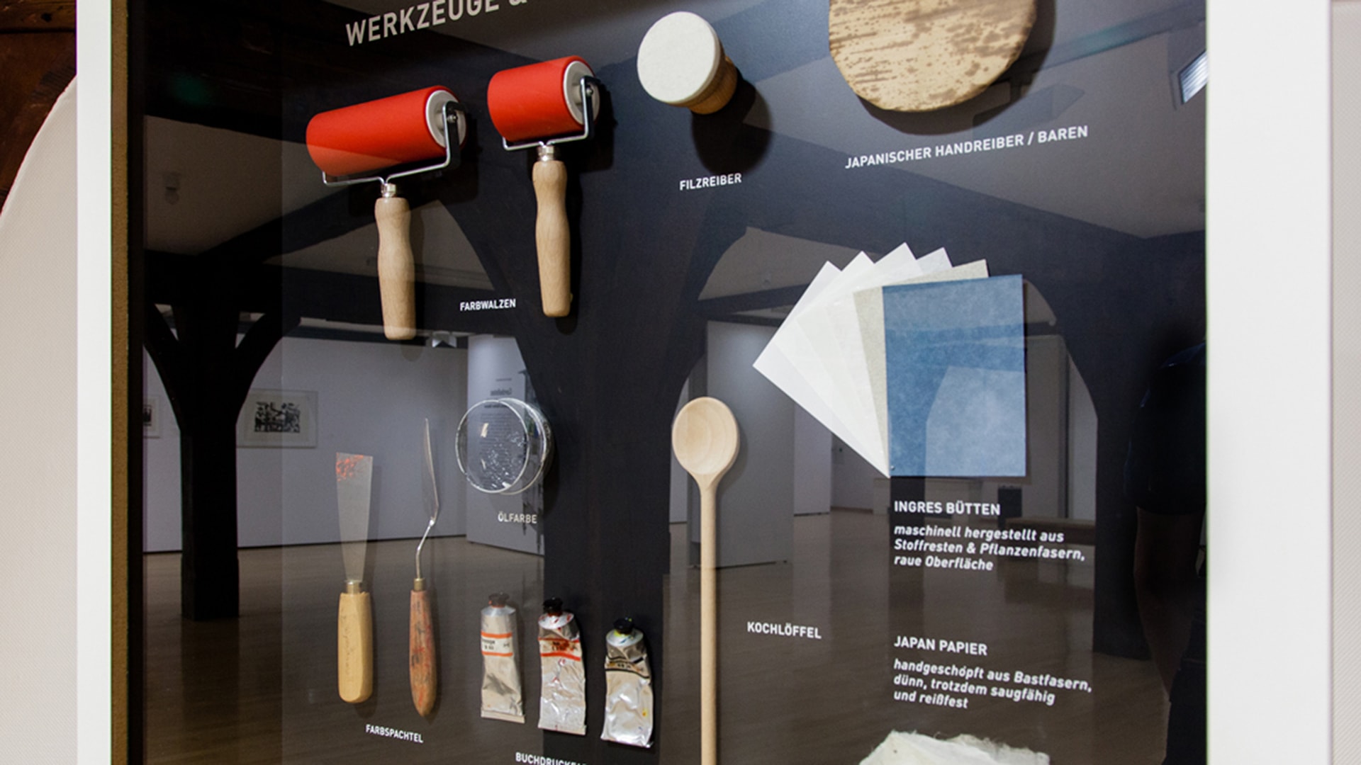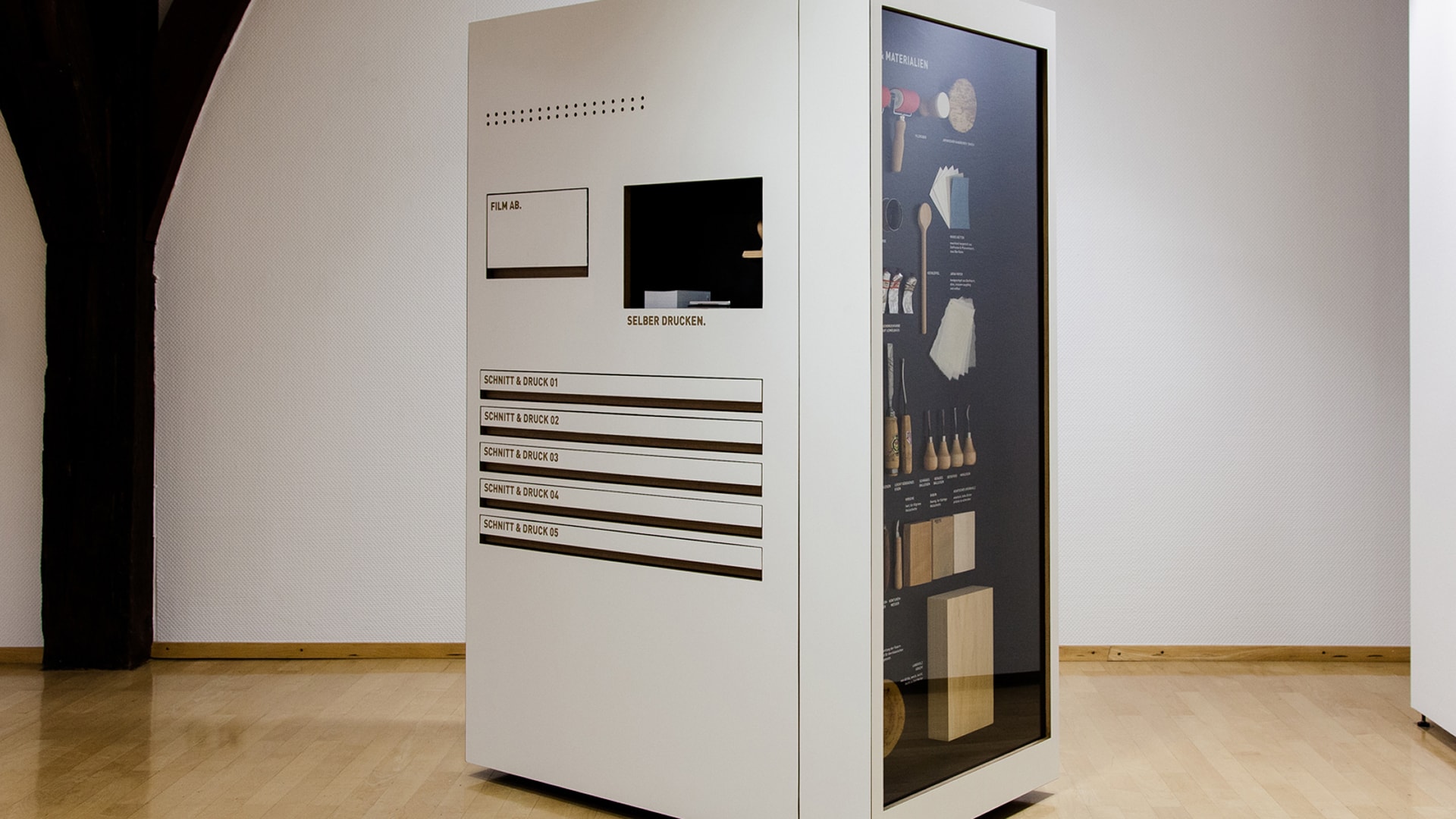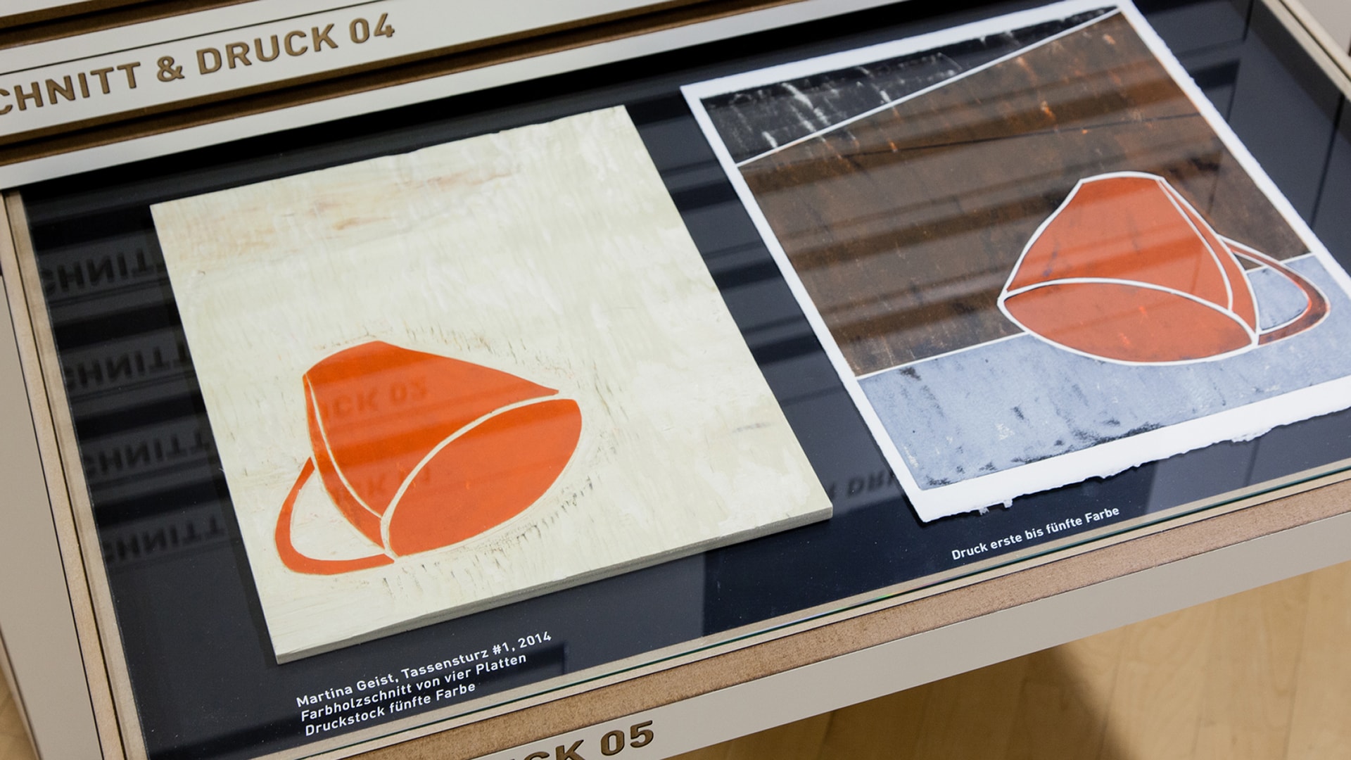 The first thematic module deals with topics such as line and surface, positive and negative, tools and materials. A film, shot in cooperation with students from Reutlingen University, shows the creation of a color woodcut, “Tassensturz N°1,” in the studio of Stuttgart artist Martina Geist. Printing blocks and prints in drawers on the same side of the module illustrate the process and result. Printing blocks that visitors can touch and a stamping station allow visitors to understand the process.