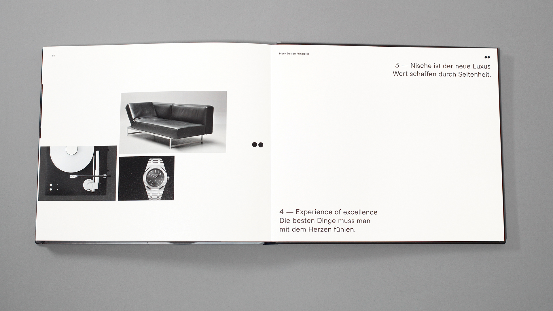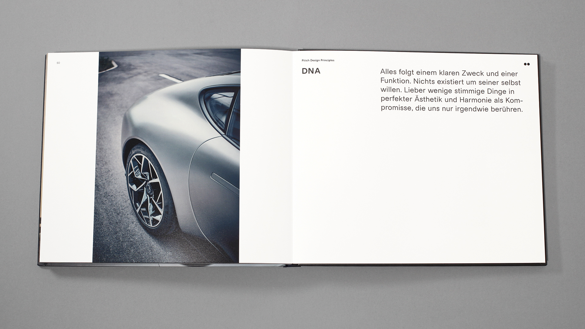 A beautifully evolving road ahead. Niche is the new luxe. Creating value through rarity. The new Piech Brand Book is released alongside the prototype from the Swiss electric vehicle manufacturer. Disruptive purism and effortless lightness are part of the Piech’s DNA. Perfect aesthetics and harmony are design principles that the new brand manifests – in both analogue and digital form. The Brand Book is published in two languages with different designs for English and German, bound using a special technique with a very flat appearance, featuring embossed Piech dots on the cover.