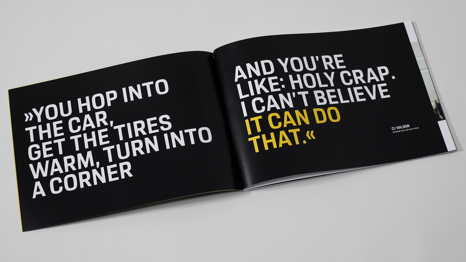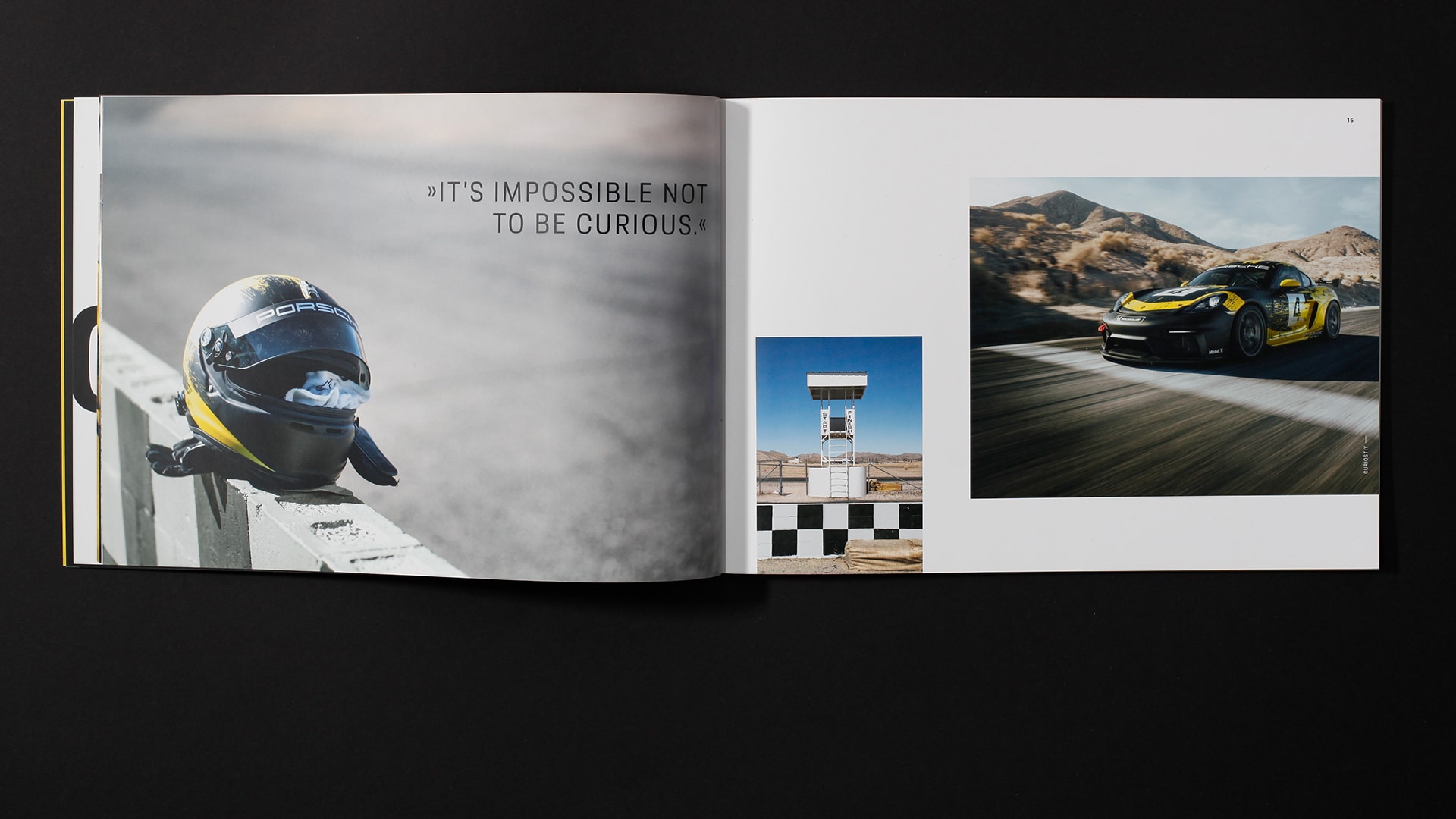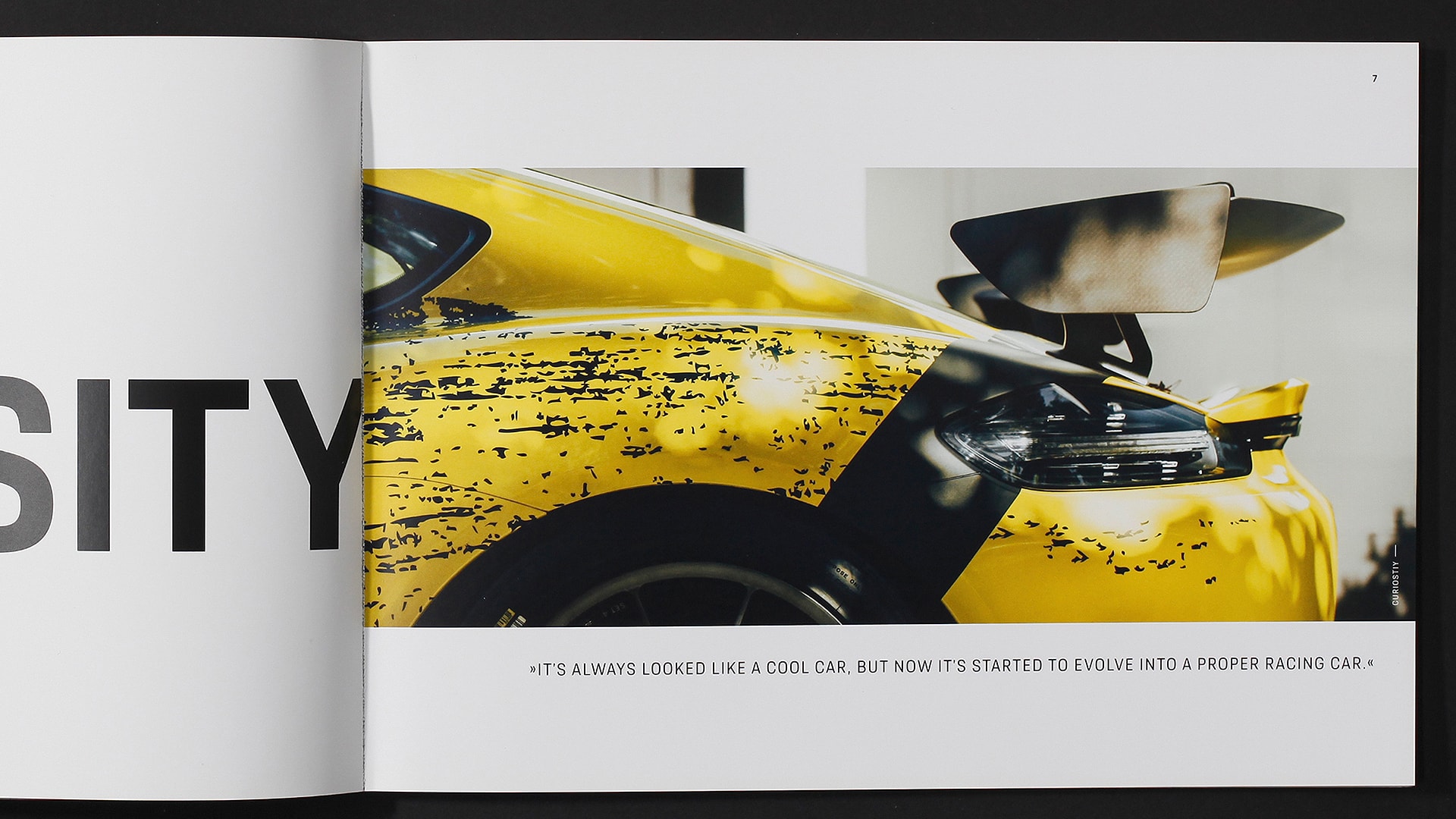 The studio designs the magalogue for the new Porsche 718 Cayman GT4 Clubsport for ramp.space. In collaboration, a magazine-style edition is created to present the new vehicle. Baseball star and racing driver CJ Wilson is portrayed in interviews and photographs. Striking typography in extreme font sizes and design elements from the vehicle’s design reflect the character of the new.